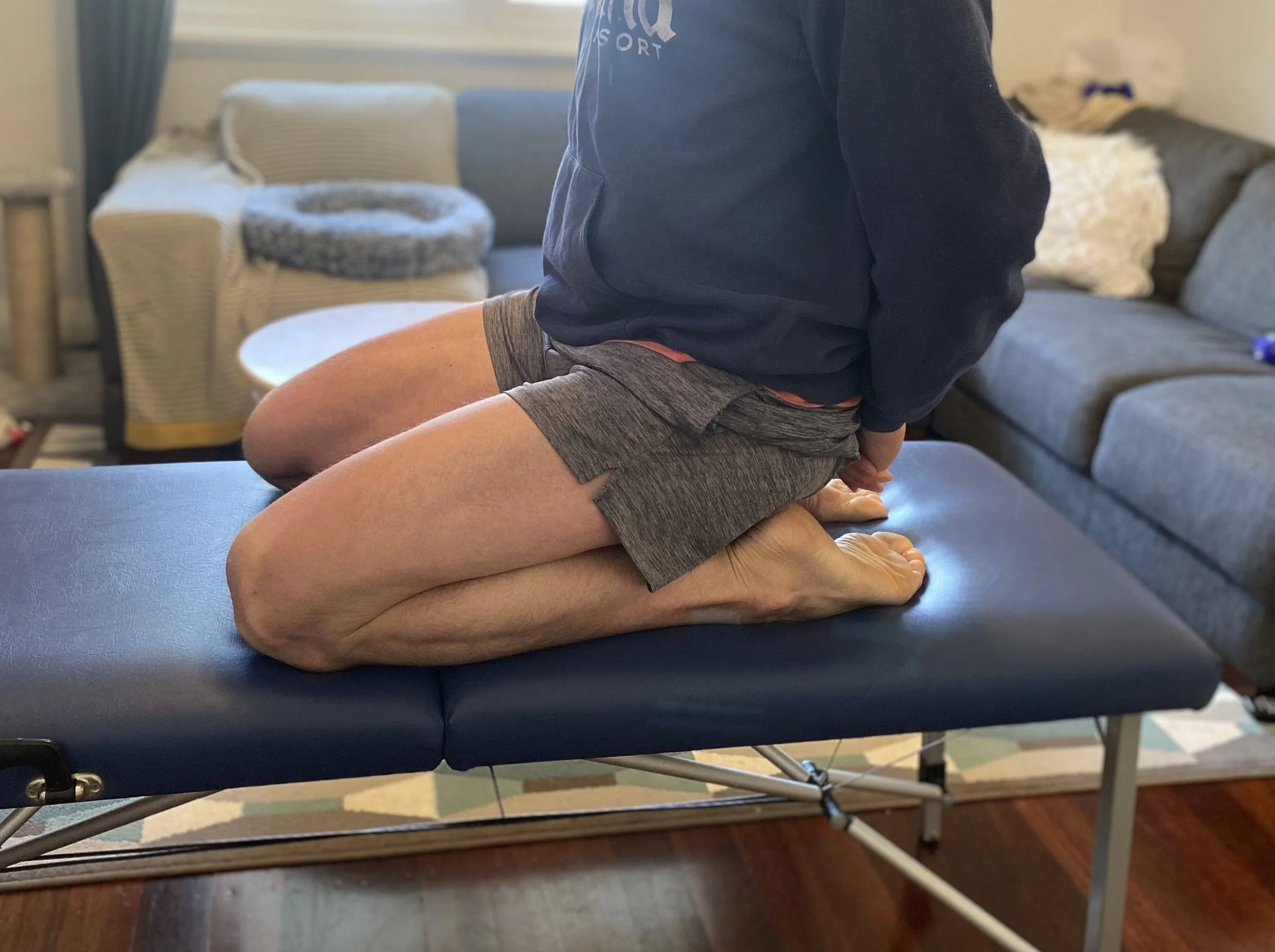 Start kneeling on a soft surface. A folded towel or yoga mat will do.